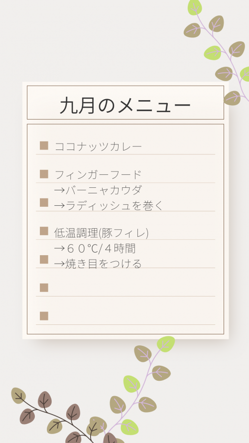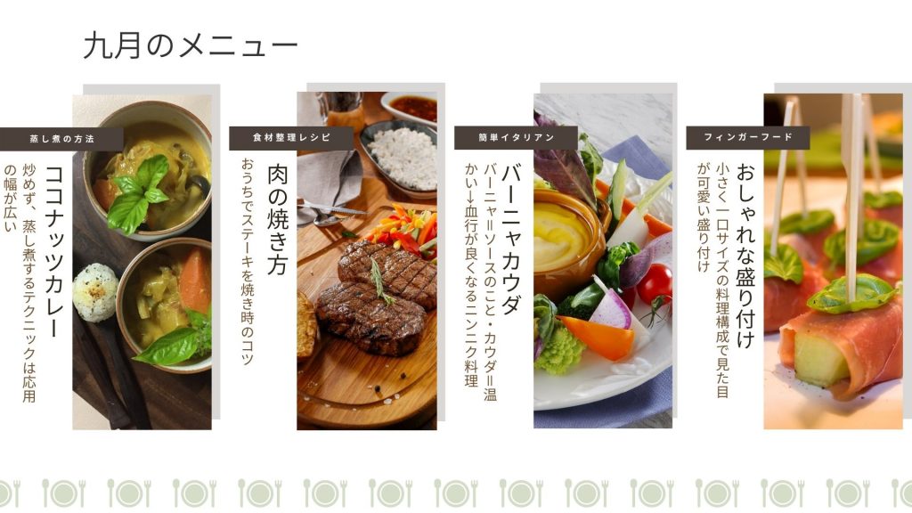 9月)ココナッツカレー・フィンガーフード・ステーキを柔らかく焼く方法
