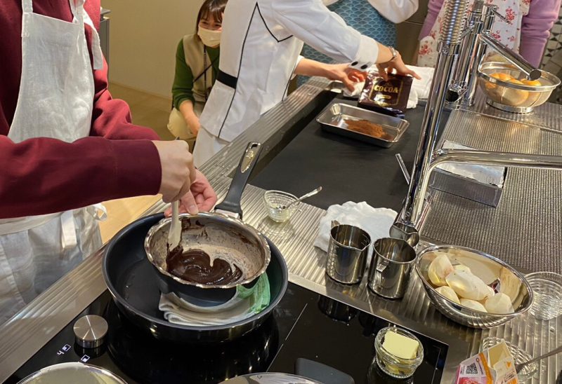 - 生クリーム200㎖/沸騰させ 少しずつ加えていく(分離→乳化→ツヤツヤ)
