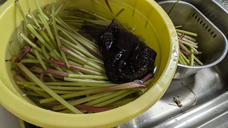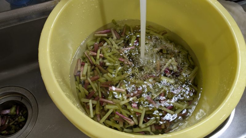 そこからさらに「十回、二十回……」と、何度も何度も洗ってアクを抜きます。一晩水にさらして、ようやく準備は完了です。