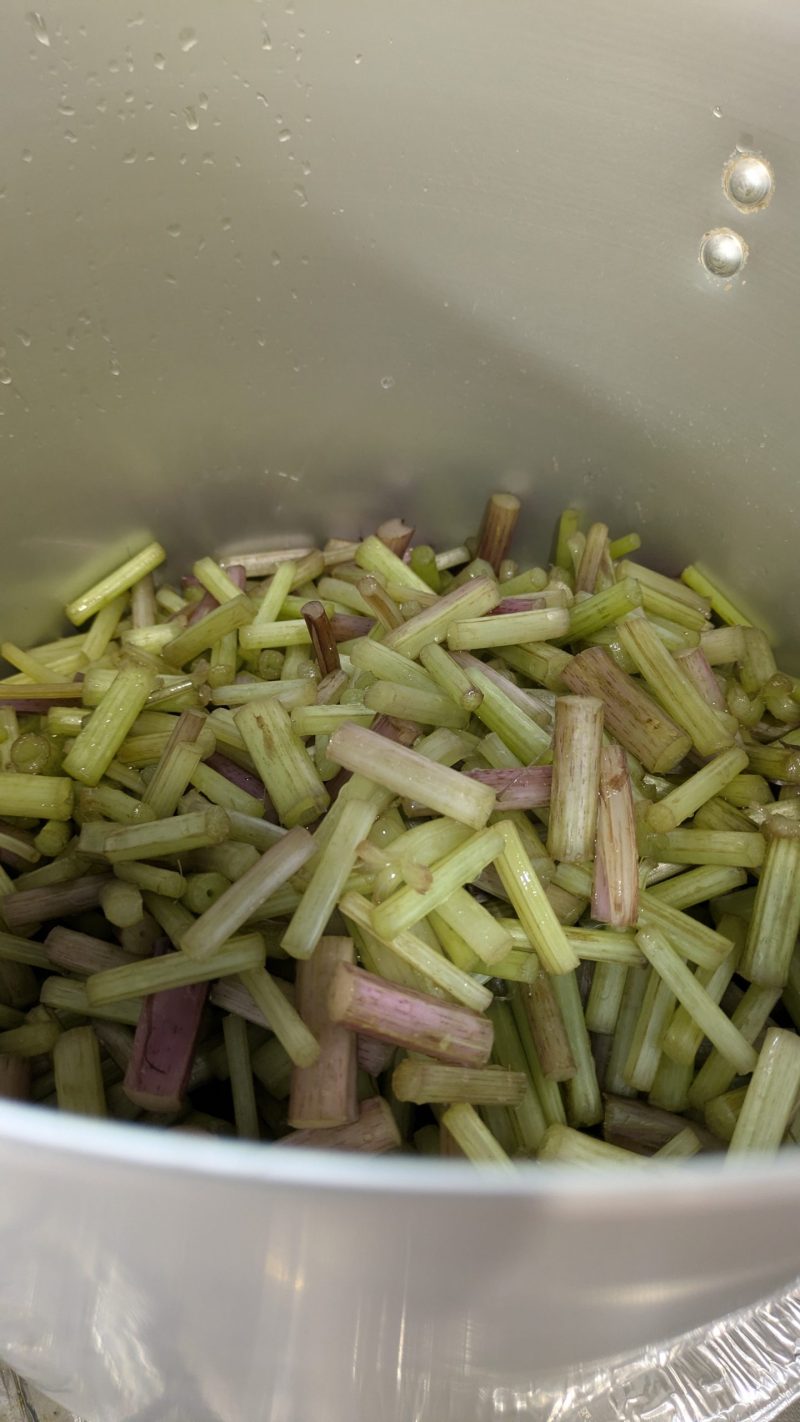 鍋がいっぱいになったら、少しずつ火が入って目減りするのを待ち、また新しい蕗を足す。