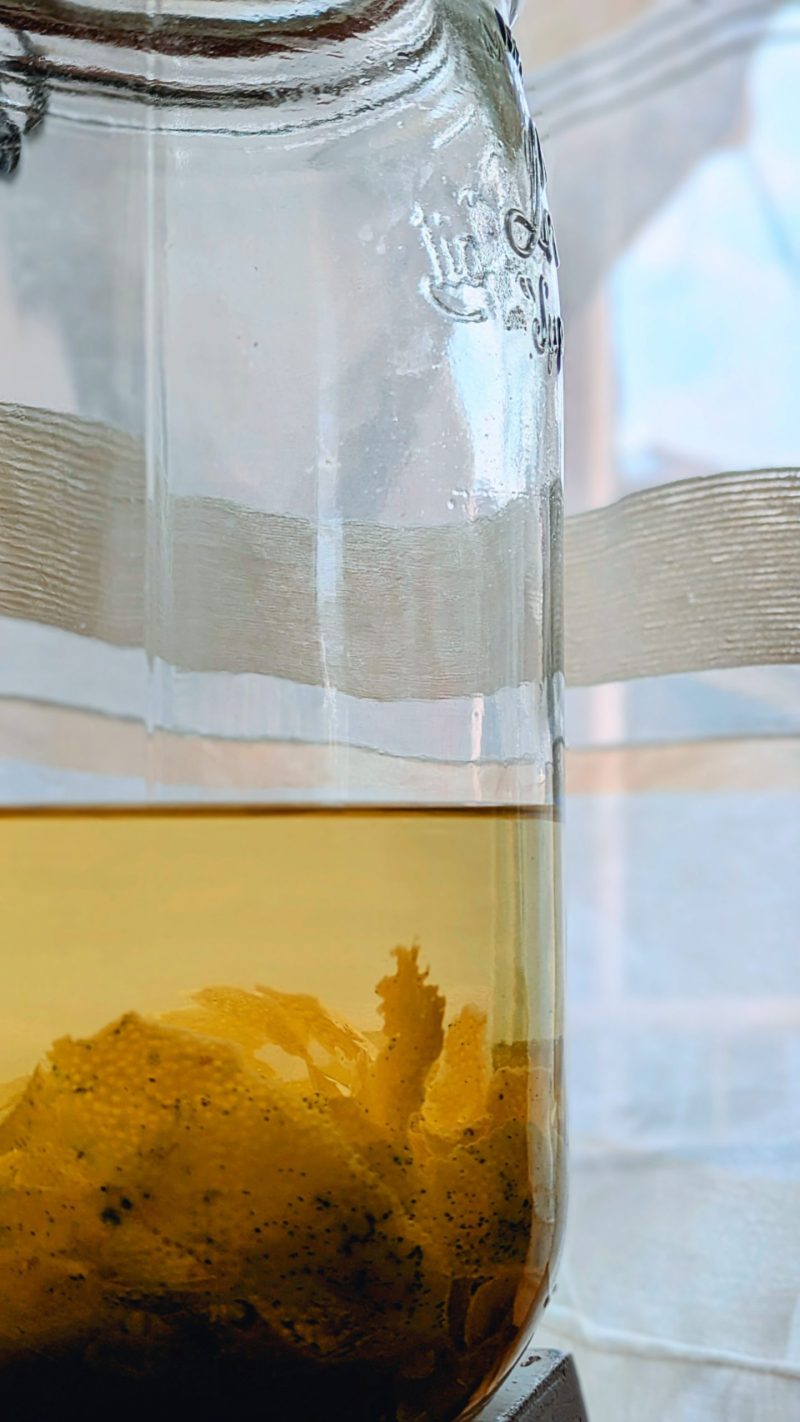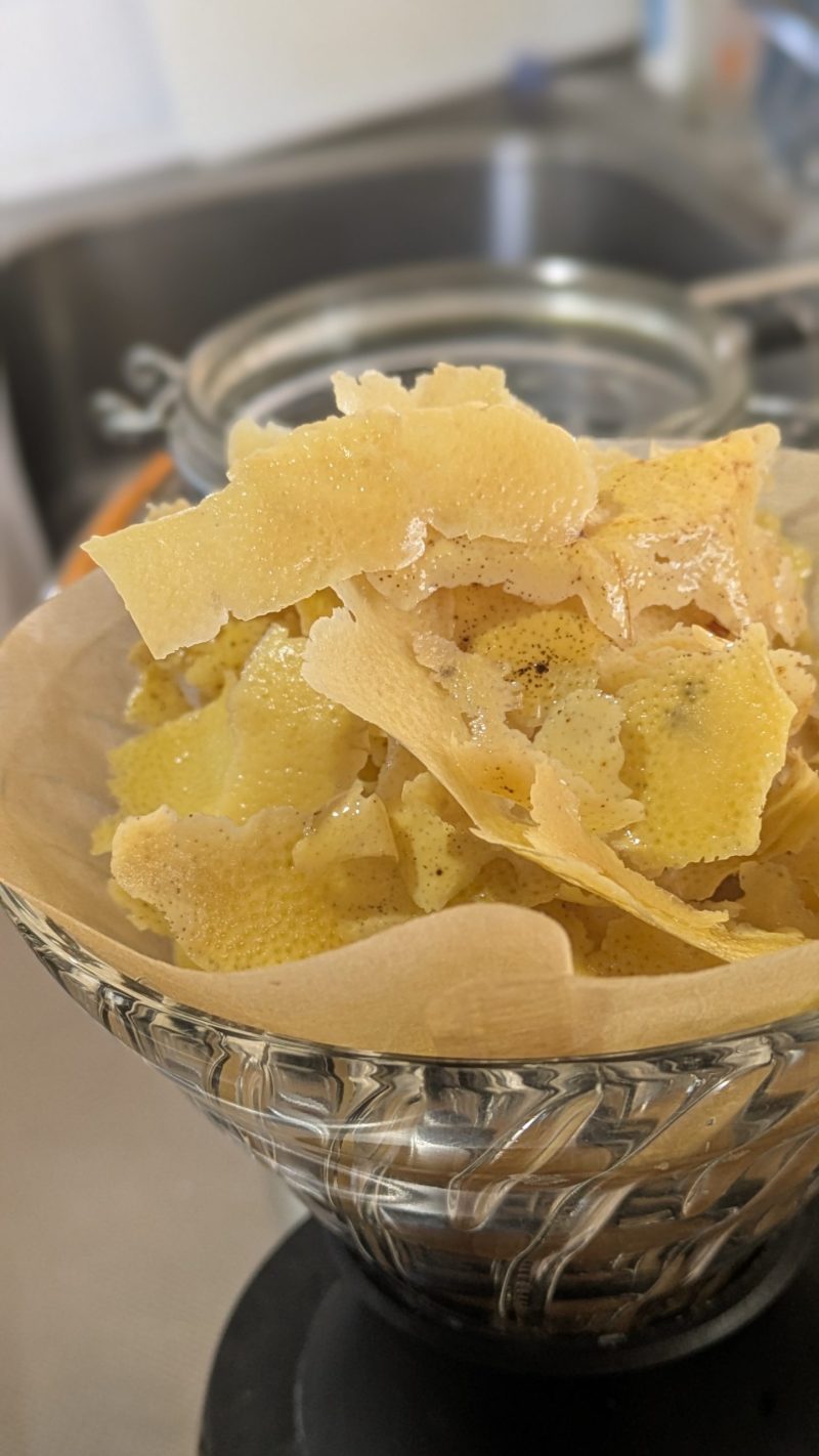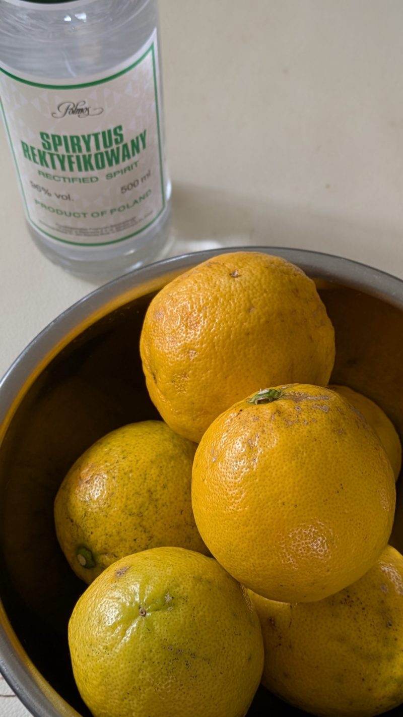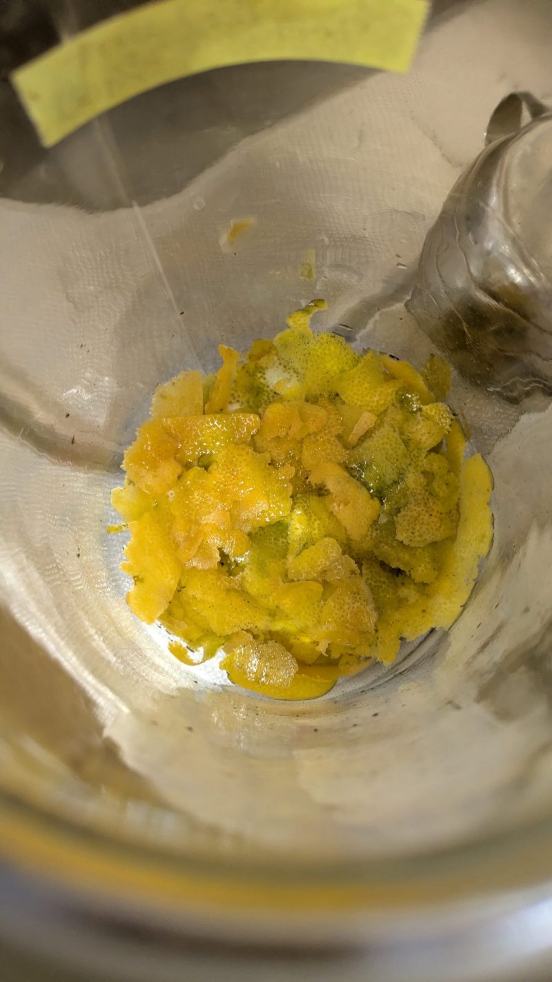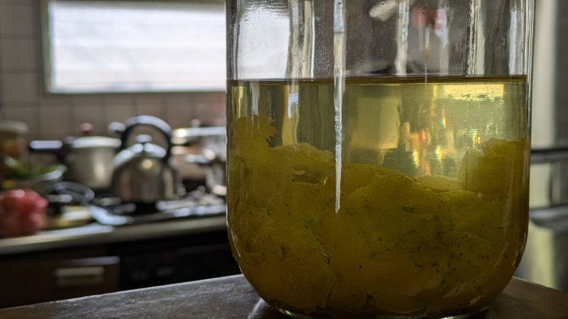 白い綿が入らないよう慎重に削ぎ、スピリタス500mlにレモン6個分の皮を漬け込みました。