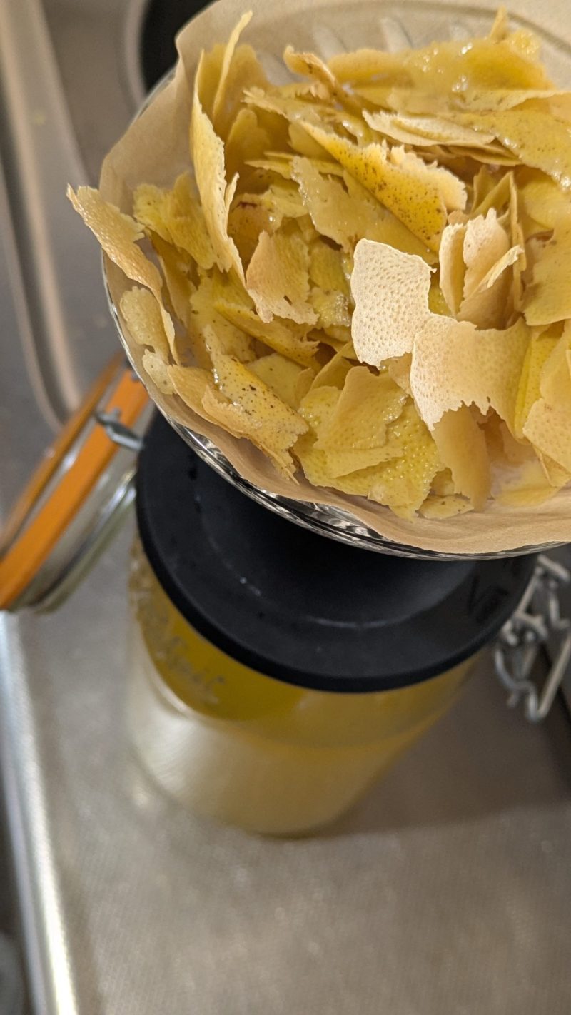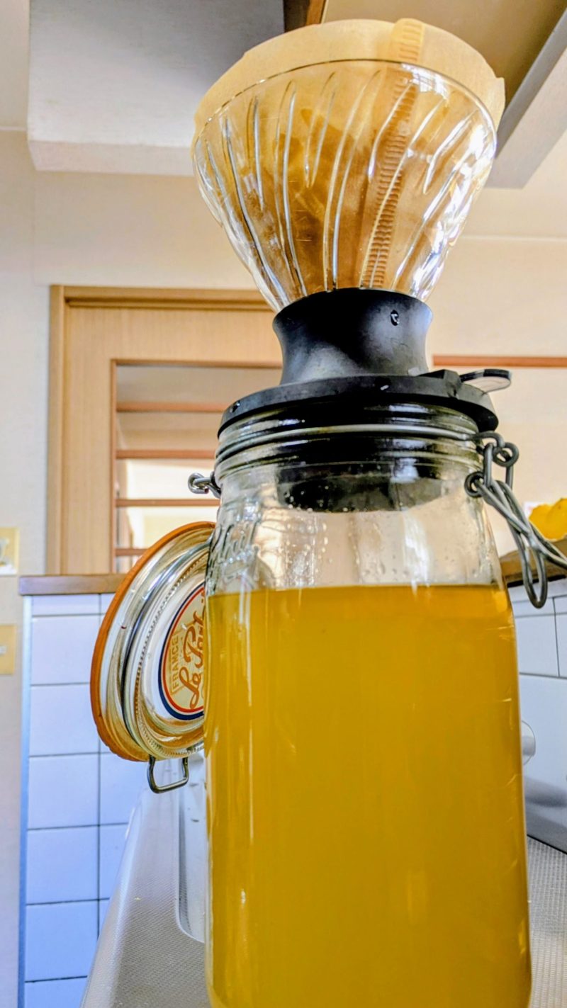 スピリタスがしっかりとレモン色に染まったら、皮をペーパーなどで濾します。