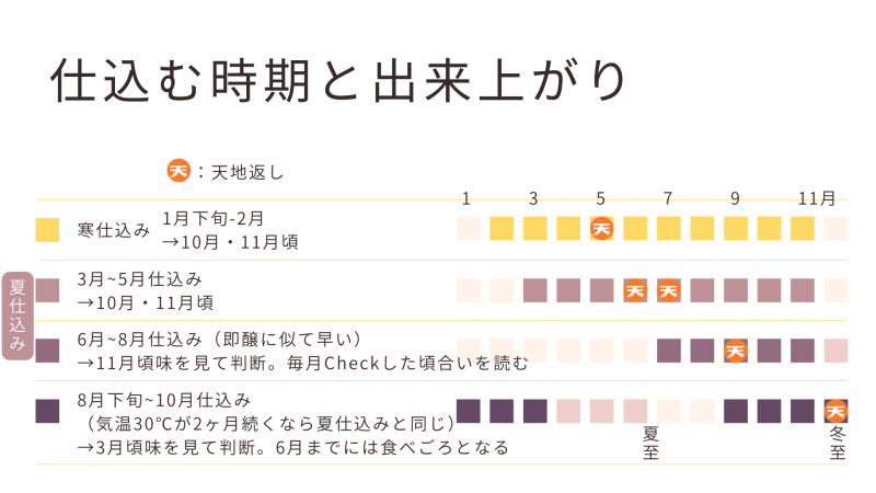 常温で約8~10ヶ月(夏を越すと美味しくなるとよく聞きます。)夏に仕込めば3ケ月ほどで食べてみてください。