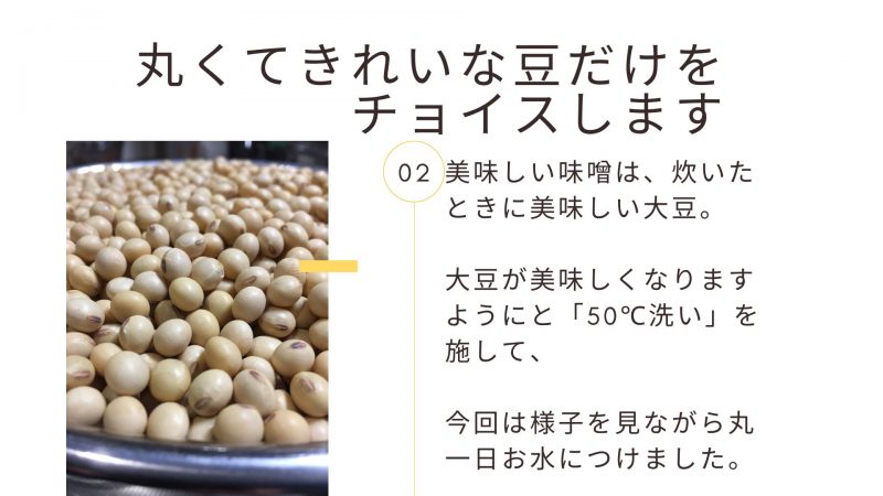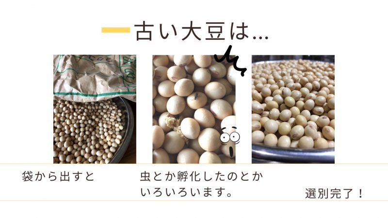 キレイな大豆だけ使います。傷んだ大豆と砂とゴミを選別するところからです。