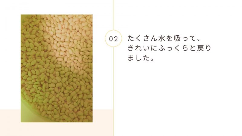 水切りして、大豆の三倍の水に浸し15~18時間かけて(芯がなくなるまで)しっかりと戻します。