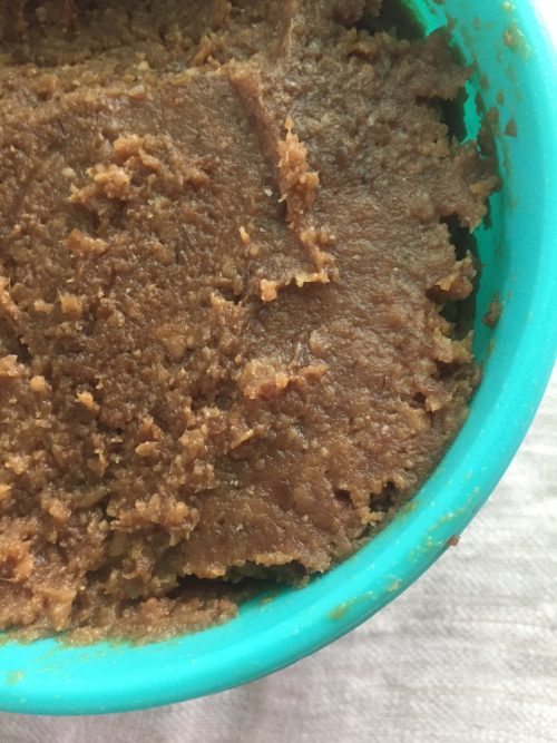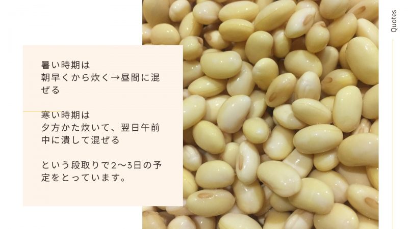 似ているときに浮いてきた大豆の皮は気持ち悪いですが、皮も一緒に潰して仕込んでいきます。