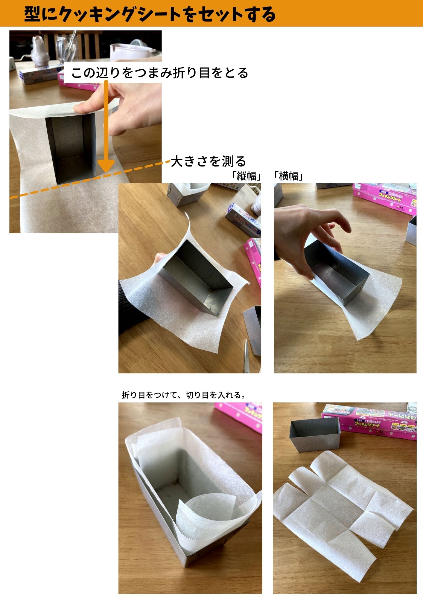 上のレシピ「使うモノ・下準備」を参考にクッキングシートを型にセットしてください。